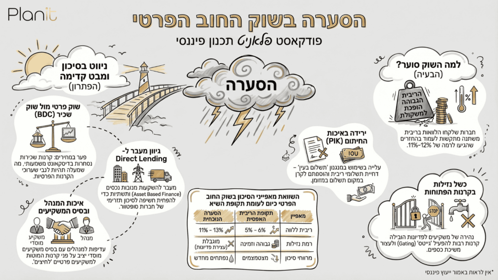 במקביל, בשוק הציבורי הופיעו מקבילות סחירות (BDC) שנסחרו בדיסקאונט משמעותי. זה גרם למשקיעים לשאול שאלה פשוטה: